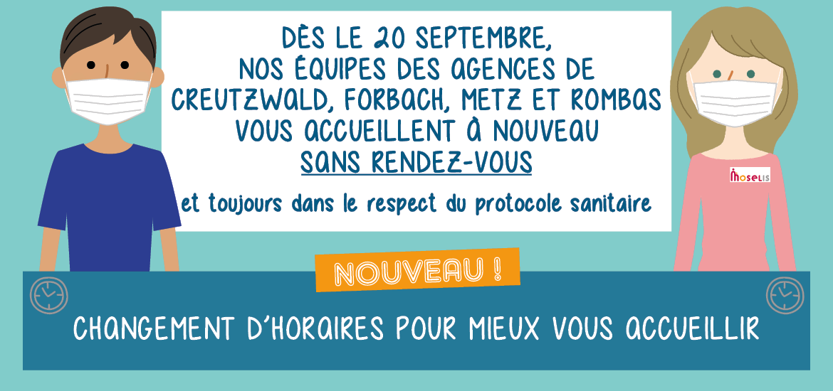 Dès le 20 septembre, plus besoin de rendez-vous pour nos agences de Creutzwald, Forbach, Metz et Rombas ! Et nous avons modifié les horaires d’accueil physique et téléphonique pour toujours mieux vous servir.