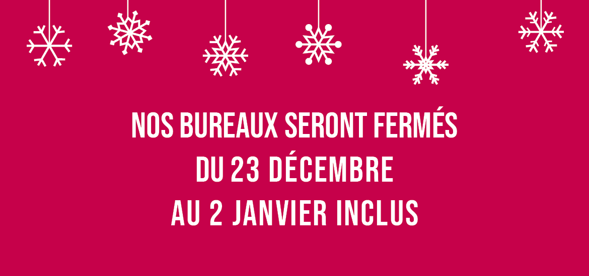 Nos bureaux seront fermés du 23 décembre au 2 janvier inclus (réouverture le lundi 3 janvier).